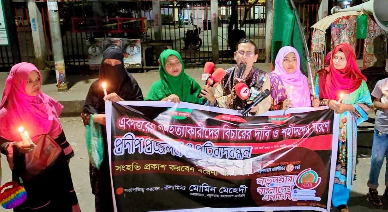 গণহত্যাকারীদের বিচার ও শহীদদের স্মরণে প্রদীপ প্রজ্জ্বলন ও প্রতিবাদ অনুষ্ঠিত হয়েছে। মঙ্গলবার (২৪ মার্চ) সন্ধ্যায় জাতীয় প্রেসক্লাবের সামনে নতুনধারা বাংলাদেশ এনডিবির চেয়ারম্যান কলামিস্ট মোমিন মেহেদীর সভাপতিত্বে অনুষ্ঠিত কর্মসূচিতে বক্তব্য রাখেন নতুনধারা বাংলাদেশ এনডিবির প্রেসিডিয়াম মেম্বার বীর মুক্তিযোদ্ধা ফজলুল হক, সিনিয়র ভাইস চেয়ারম্যান শান্তা ফারজানা, ভাইস চেয়ারম্যান ডা. নূরজাহান নীরা, ভারপ্রাপ্ত মহাসচিব কাজী মুন্নি আলম, যুগ্ম মহাসচিব ওয়াজেদ রানা প্রমুখ। সংহতি প্রকাশ করেন আয়াতুল্লাহ আকতার।